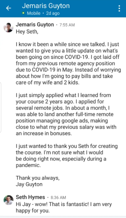 Matt Kehr got his first agency job within a month of completing the course and is now making $70K after just 1 year of work experience in Digital Marketing.